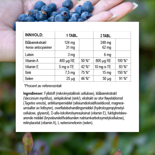 Innhold per døgndose: 1 tablett 2 tabletter Blåbærsekstrakt 124 mg 248 mg -herav antocyaniner 31 mg 62 mg Lutein 3 mg 6 mg Vitamin A (RE) 400 µg (50%*) 800 µg (100%*) Vitamin E (a-TE) 5 mg (42%*) 10 mg (83%*) Sink 7,5 mg (75%*) 15 mg (150%*) Selen 25 µg (45%*) 50 µg (91%*) * RI: Referanseinntak.